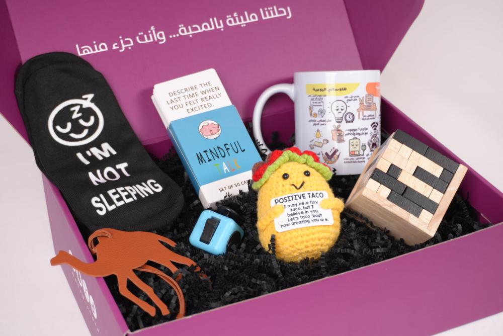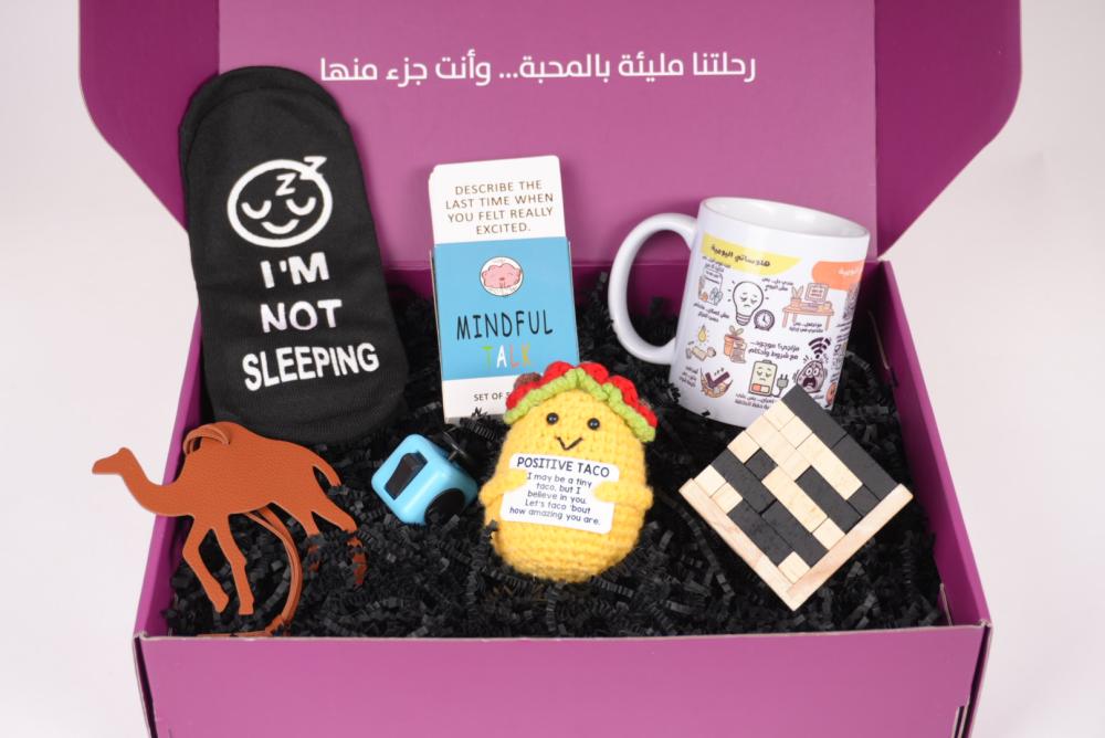 كوب ممتع، لعبة بطاقات تفاعلية، علاقة شنطة لطيفة، جوارب مرحة، دمية كروشيه تحفيزية، كرة تخفيف التوتر أو أداة فيجيت، ولغز ذهني صغير.